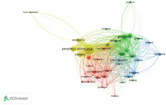 Cooperative relationship between the top 40 most productive countries. (Each node represents an individual country, and the node size represents the number of publications. The width of the lines indicates the link strength.)
