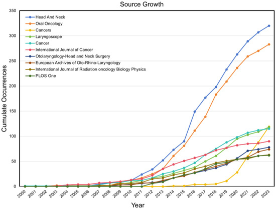 Head and Neck and Oral Oncology demonstrated significantly higher publication volumes of articles compared to the others, collectively accounting for 15.1% of the total publications included in the study, with 8.0% and 7.1%, respectively, for each journal. In addition, the two journals above had the most significant rate of growth in the number of articles published on HPV-positive OPSCC research, with the cumulative number of publications in 2023 being approximately six times greater than that a decade ago (Figure 5). Cancers has experienced a significate increase in the number of publications since 2019, and the cumulative number of publications in 2023 was approximately ten times greater than that in 2019. It ranked third in terms of the number of publications in the field of HPV-positive OPSCC (Table 4).