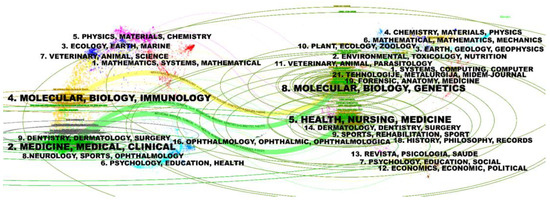 Dual-map overlay and corresponding disciplines. (The citing journals are on the left, the cited journals are on the right, and the colored path represents the citation relationship).