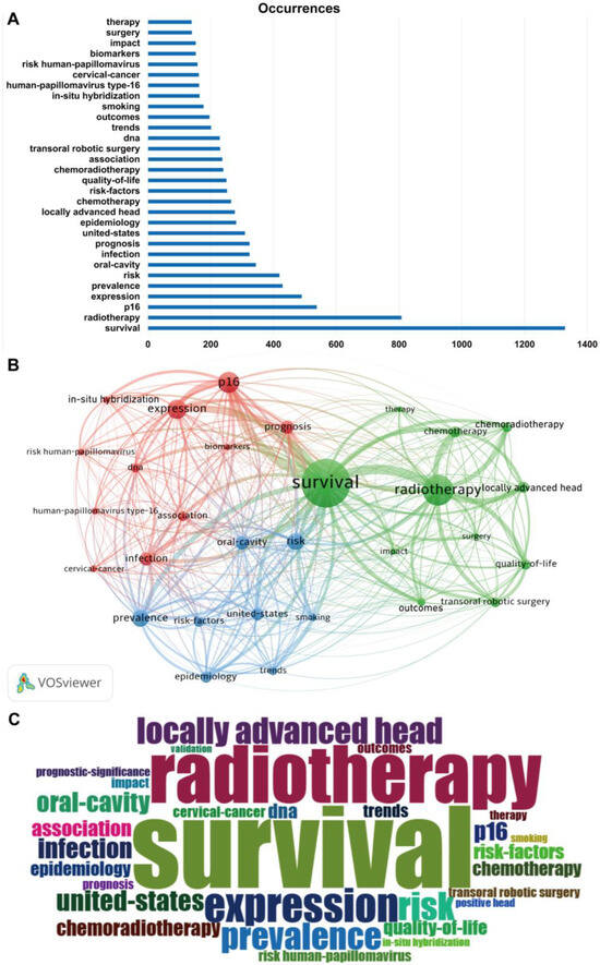 Keywords are the condensation and refinement of the core content of publications, and the high frequency of keywords can reflect the research hotspots in HPV-positive OPSCC research. After excluding terms synonymous with HPV and OPSCC, the top 30 keywords based on frequency included survival (frequency of 1329), radiotherapy (808), locally advanced head (277), chemotherapy (265), quality-of life (250), chemoradiotherapy (240), transoral robotic surgery (230), outcomes (196), impact (152), surgery (140), therapy (139), which were related to the treatment and prognosis of HPV-positive OPSCC (green cluster). Another keyword cluster (red cluster) included p16 (frequency of 538), expression (490), infection (324), prognosis (324), association (237), dna (229), in-situ hybridization (164), human-papillomavirus type-16 (163), cervical cancer (162), risk human-papillomavirus (158), biomarkers (152), relevant to basic research and biological characteristics of HPV-positive OPSCC. Prevalence (429), risk (419), oral-cavity (344), united-states (309), epidemiology (281), risk-factors (252), trends (201), and smoking (177) were combined in a cluster (blue cluster) involving the epidemiology and risk factors (Figure 7A,B). A word cloud plot of the top 30 high-frequency keywords on HPV-positive OPSCC was generated and visualized by the R package Bibliometrix 4.3.3 (Figure 7 C).