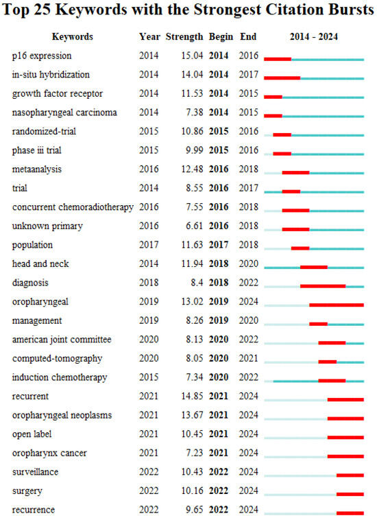 Regarding the time of citation burst, research before 2016 mainly focused on the molecular characteristics of OPSCC, discovering a strong agreement between expression of p16 and tumor HPV status in OPSCC and better prognosis for p16-positive patients. From 2017 to 2020, research concentrated on the clinical management and treatment of HPV-positive OPSCC, with clinical trials exploring treatment de-escalation strategies. After 2021, continuous monitoring post-treatment and postoperative recurrence in HPV-positive OPSCC have become research hotspots.