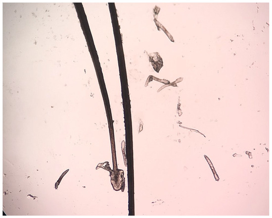 The mature D. folliculorum forms were most often detected, while larvae and nymphs were found less frequently. In woman infected with D. brevis, only the mature forms were found. Eggs were noted in three pre- and perimenopausal women infected with D. folliculorum. Cylindrical dandruff was found in all infected women (Figure 1).