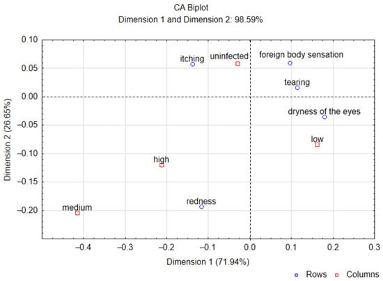 Figure 2 presents a correspondence analysis (CA) that visually shows the relationship between Demodex spp. infection and the occurrence of five ocular symptoms (itching, tearing, redness of the eyelids, dry eyes, and foreign body sensation) in pre- and perimenopausal women. Due to the low quality of the score for the symptom of excessive eyelash loss (0.48), indicating poor representation in two-dimensional space, a correspondence analysis was performed without taking into account the frequency of this symptom. The CA plot explained a total variance of 98.59%, which accounted for the combination of 71.94% of the variance with Dimension 1 and 26.65% with Dimension 2. Low intensity of Demodex spp. infestation was closely associated with the occurrence of dry eyes, while high and medium intensities of Demodex spp. infestation were associated with the occurrence of eyelid redness.