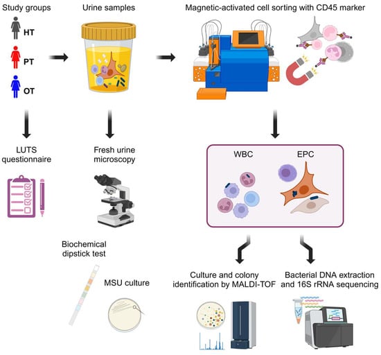 Experimental design. Three study cohorts answered a 39-point LUTS questionnaire and provided urine samples. Fresh urine microscopy was performed to enumerate urinary white blood cells and epithelial cells followed by standard diagnostic tests with biochemical dipstick and MSU culture. The urine samples were then sorted via CD45 magnetic-activated cell sorting into leukocyte-enriched WBC and leukocyte-depleted EPC fractions. These fractions were subsequently cultured and sequenced to examine the bacterial profiles. Figure created in BioRender.com. HT: healthy; PT: chronic UTI pre-treatment; OT: chronic UTI on treatment; LUTS: lower urinary tract symptoms; MSU: midstream urine; WBC: white blood cell fraction; EPC: epithelial cell fraction.
