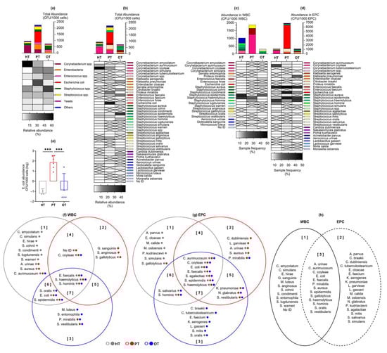 Abundance of bacteria and yeast isolated from urine culture following CD45 sorting into WBC and EPC fractions. Total abundance (CFU/1000 cells) is shown in (a) microbial groups or (b) individual species, as well as those associated with (c) WBC and (d) EPC. Bar charts show the mean with 95% CI while heatmaps show relative bacterial abundance (a,b) and sample frequency (c,d). There were no significant differences in the mean CFU/1000 cells between study groups, except for (e) Escherichia coli at *** p ≤ 0.001 (one-way ANOVA with Fisher’s LSD test for multiple comparisons). The Venn diagrams show bacteria species that were associated with (f) WBC and (g) EPC in the three study groups. The colored dots after each species name refer to their presence in the study groups. For instance, in diagram (f) set [], Corynebacterium aurimucosum was isolated from all study groups (gray, red and blue dots) but only associated with WBC in HT (gray circle). The diagram in (h) shows an overview of the species found only in WBC [], EPC [] or both fractions []. HT: healthy; PT: chronic UTI pre-treatment; OT: chronic UTI on treatment; WBC: white blood cell fraction; EPC: epithelial cell fraction; CFU: colony-forming unit.