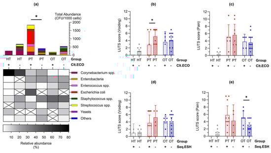 Lower urinary tract symptoms differed in individuals with Escherichia coli in enriched culture and Escherichia-Shigella group in 16S rRNA sequencing. (a) Abundance bar charts are shown in microbial groups with their relative abundance shown in the heatmap for samples with or without E. coli growth in culture (Clt.ECO). Total abundance was higher in PT samples containing E. coli; (b,c) Voiding symptom score was higher in samples that were Clt.ECO- in PT while there were no differences in the pain score; (d,e) Conversely, there were no differences in the voiding symptom score but pain score was higher in samples containing Escherichia-Shigella group in sequencing (Seq.ESH). Bar charts show the mean with 95% CI. Significant differences between groups are indicated at * p ≤ 0.05 (two-way ANOVA with Fisher’s LSD test for multiple comparisons). HT: healthy; PT: chronic UTI pre-treatment; OT: chronic UTI on treatment; CFU: colony-forming unit.
