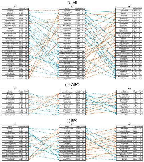 To examine how the bacterial ecology shifted from the healthy population to diseased, two pairs of study group comparisons were conducted—from HT to PT and PT to OT. When analyzing the microbial ecologies associated with WBC and EPC collectively, 42 genera exhibited significant shifts in relative abundance. Of these, 12 genera showed significant changes between HT and PT, while 33 genera differed between PT and OT (Figure 7a). Specifically, WBC-associated bacteria revealed changes in 2 genera from HT to PT and 12 genera from PT to OT (Figure 7b). EPC-associated bacteria displayed significant alterations in 7 genera from HT to PT and 14 genera from PT to OT (Figure 7c). There were no significant differences in the alpha- and beta-diversity indices in the sequenced samples within and between the study groups.