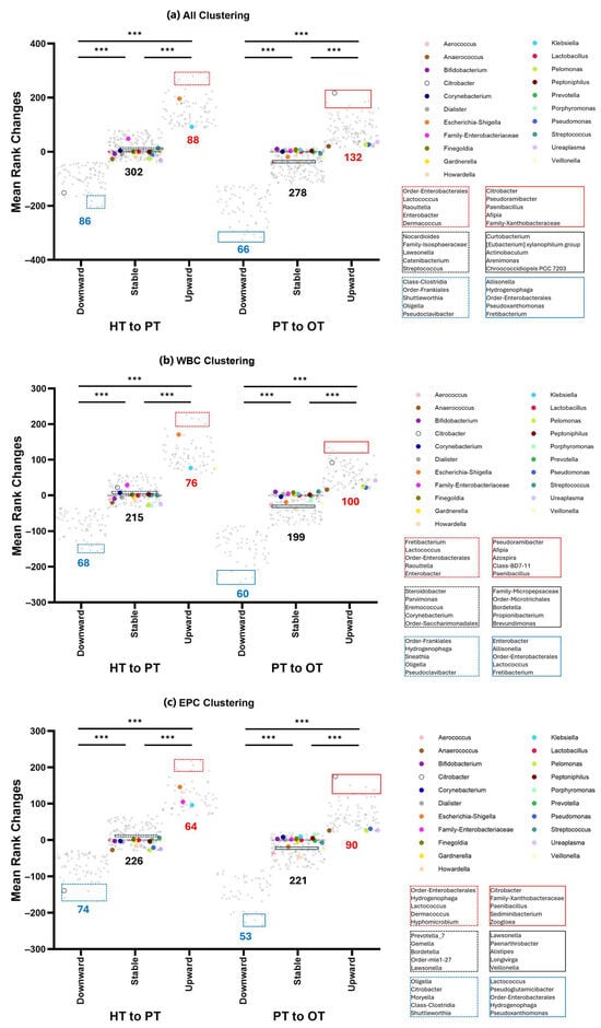 K-means clustering of 16S rRNA sequencing data showed three distinct clusters that shifted from the healthy population to diseased. The number of genera that comprises downward, stable or upward are indicated below the clusters shown in (a) all samples; (b) WBC and (c) EPC. Genera with the highest relative abundances (top 21) are color-coded and mostly belonged in the stable communities. Bacteria that showed the least amount of rank changes in the stable clusters around y = 0 are highlighted (black) and listed. The top 5 genera with the largest upward (red) or downward (blue) shifts are also highlighted and listed. Within each comparison from HT to PT (dashed lines) and PT to OT (solid lines), the three clusters are significantly different from one another at *** p ≤ 0.001 (one-way ANOVA with Bonferroni test for multiple comparisons). HT: healthy; PT: chronic UTI pre-treatment; OT: chronic UTI on treatment; WBC: white blood cell fraction; EPC: epithelial cell fraction.