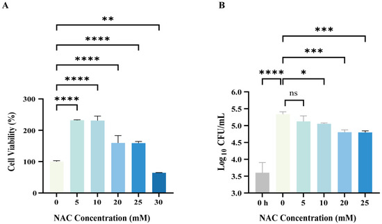 Macrophages are the initial and predominant phagocytes in the innate immune system. They can engulf M. abscessus within their cells and break them down by forming phagolysosomes. We first evaluated the effect of NAC on M. abscessus-infected macrophages. The administration of NAC did not exhibit cytotoxicity at concentrations ranging from 5 to 25 mM and even increased the cell viability of THP-1-derived M0 macrophages; however, this was not observed at a 30 mM concentration (Figure 1A). This also corroborates the previous finding that NAC has an extremely high in vitro MIC against CLR-resistant M. abscessus (Table 2) [31,32], suggesting that NAC controls the spread of M. abscessus not through a direct bactericidal effect but through its prominent protective properties against macrophages. M. abscessus infiltrates macrophages, where it continues to replicate and proliferate within the cell, ultimately rupturing the cell and disseminating it. For intracellular antimycobacterial effects, 20 mM and 25 mM NAC significantly inhibited the intracellular growth of M. abscessus by reducing ~0.5 log10 CFUs (Figure 1B). When NAC was utilized to clear M. abscessus, a dose-dependent bactericidal effect was observed with stepwise increases in concentration from 5 to 25 mM (Figure 1B). Thus, these data strongly suggest that NAC is highly effective in exerting intracellular antimicrobial activity against M. abscessus.