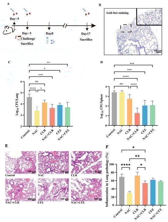 Nude mice were purchased from specific pathogen-free (SPF) Biotechnology Co., Ltd. (Beijing, China). They were inoculated with 5 × 107 CFUs of M. abscessus using a Glas-Col aerosol infection device. The bacterial quantities in the lungs were evaluated two hours after infection. On the third day after infection, NAC was administered through intraperitoneal (i.p.) injection at a dose of 150 mg/kg every other day. CLR and CFZ were administered orally once a day using a solution of carboxymethyl cellulose sodium at doses of 100 and 20 mg/kg, respectively. NAC was administered with a minimum interval of one hour from the other treatment medications to prevent any potential interaction. Seventeen days after being given the treatment, the mice were euthanized, and their bodies were placed on Middlebrook 7H11 agar and kept at 37 °C for 4 days. After that, the number of CFUs in the lungs and spleens of the infected mice was counted.