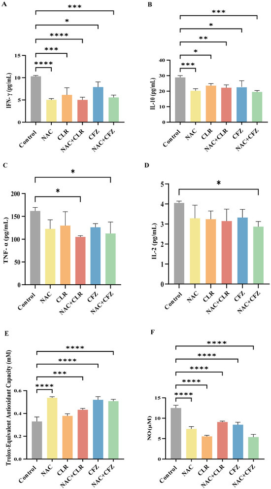 The inflammatory storm and oxidative stress in M. abscessus-infected mice treated with NAC combined with CLR and CFZ. (A–D) Plots displaying the levels of cytokines Interferon- gamma (IFN-γ) (A), Interleukin-10 (IL-10) (B), Tumor Necrosis Factor-α (TNF-α) (C), and Interleukin-2 (IL-2) (D) in the serum of infected nude mice after 17 days of treatment, n = 3. (E) A diagram illustrating the overall antioxidant capacity of nude mice following a 17-day therapy. (F) A graph depicting the concentrations of nitric oxide (NO) following a 17-day therapy in nude mice, n = 3. The data are presented as means ± standard deviation. Statistical significance is indicated by asterisks: (*, p < 0.05; **, p < 0.01; ***, p < 0.001; ****, p < 0.0001).
