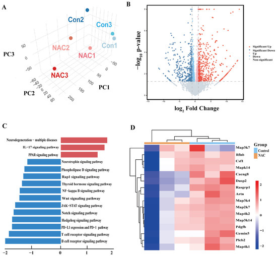RNA sequence (RNA-seq) analysis of untreated and NAC-treated M. abscessus-infected mice. (A) A three-dimensional plot depicting the principal component analysis (PCA) of RNA-seq data from the control and NAC groups of the M. abscessus mice model. (B) A volcano plot comparing gene expressions between the NAC and control groups. (C) KEGG-based GSEA was performed on the differentially expressed genes in the NAC and control groups. The top 15 pathways were identified, and both up and downregulated pathways were ranked based on the gene ratio, which is the number of mapped genes divided by the number of genes in the pathway. (D) Heatmap displaying the expression levels of genes associated with the mitogen-activated protein kinase (MAPK) pathway in both the control and NAC groups.