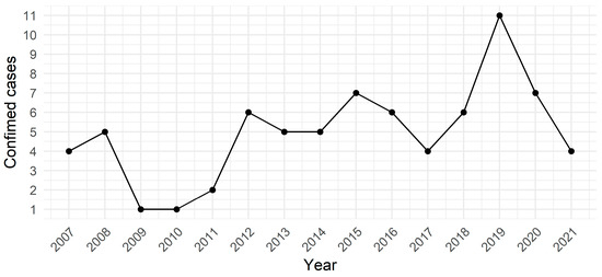 Time series of confirmed cases of Brazilian Spotted Fever in municipalities in Middle Paranapanema River basin, São Paulo state, southeastern Brazil, from 2007 to 2021.