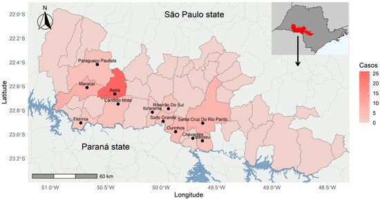 Herein, the number of confirmed cases ranged from 1 (in 2010) to 11 (2019) (Figure 2), with the highest number of cases in April (11 cases) and the lowest in July (1 case). The geographical distribution of confirmed FMB cases in the municipalities of the Middle Paranapanema Basin from 2011 to 2021 was gathered and presented (Figure 3).