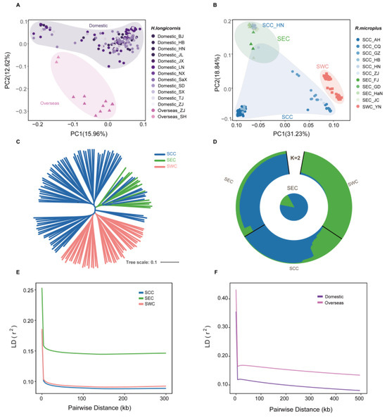 Population structures of H. longicornis and R. microplus. (A,B) Principal component analysis (PCA) plot showing segregation of H. longicornis and R. microplus individuals, respectively. Differently colored shapes represent samples from different populations and provinces. SCC, South Central China; SEC, Southeast China; SWC, Southwest China. (C) Phylogenetic structure of R. microplus populations. (D) Population genetic structure of all R. microplus sample accessions, as estimated using ADMIXTURE with the best K = 2. The outer circle graphic shows the ancestry proportions of each individual, and the center pie chart highlights the ancestry proportions of the SEC population. Each color represents a different ancestral composition. (E,F) LD decay in different populations of H. longicornis and R. microplus.
