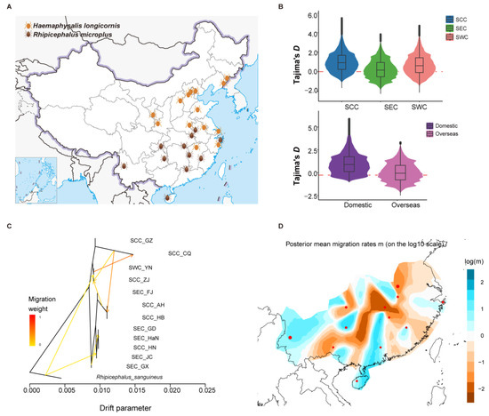 Gene diversity and gene flow of H. longicornis and R. microplus in different geographical regions. (A) Regional distribution of the two tick species in China. (B) Tajima’s D values of the two tick species in different regions. (C) Gene flow between the different regions for R. microplus populations. (D) Migratory patterns of R. microplus based on EEMS (estimated effective migration surface).