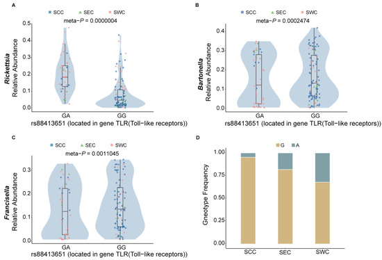 The tick genetic variant rs88416395 is correlated with the abundance of tick-borne pathogens. (A–C) Correlation of a Toll-like receptors SNP (rs88418395) with Rickettsia, Bartonella, and Francisella abundance, respectively. (D) Genotype frequency of rs88418395 among the SCC, SEC, and SWC populations.