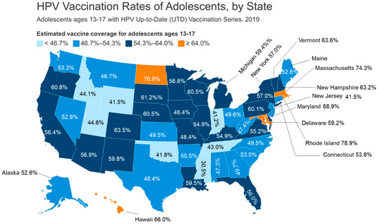- HPV (Human Papillomavirus) Vaccine Requirements for Secondary School. Available online: https://www.immunize.org/official-guidance/state-policies/vaccine-requirements/hpv-secondary-2024/ (accessed on 11 July 2024).