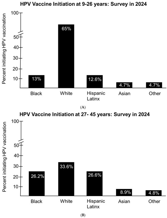 - Chan, J.K.; Mann, A.K.; Lee, D.B.; Rohatgi, A.; Chan, C.; Abel, M.K.; Argueta, C.B.; Kapp, D.S. Human papillomavirus vaccination trends and disparities in the United States: Who is getting left behind? Sex. Transm. Dis. 2021, 48, 714–719. [Google Scholar] [CrossRef] [PubMed]