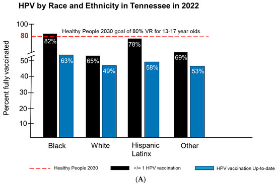 We examined the 2022HPV vaccination rates for Tennessee by race/ethnicity, insurance coverage, and urbanicity for 13–17-year-olds (Figure 6A). The Healthy People 2030 goal is an 80% vaccination rate for 13–17-year-olds in the US with regard to receiving >/= to one dose of the HPV vaccine or completing the dosing regimen and being up to date (UTD) [26]. Tennessee fell short of these goals, with the exception of Black Tennesseans, who achieved an HPV vaccination rate of 82% (Figure 6A) compared to White (65%), Hispanic/Latinx (58%), and others (69%) for populations receiving </= to one dose [27]. For populations of 13–17 years that were to be up to date, no race or ethnic group in Tennessee reached a rate of 80%. The rates observed for all races and ethnicities included Black Tennesseans at 63%, followed by Hispanic/Latinx populations at 58%, others at 53%, and White Tennesseans at 49% (Figure 6A) [27]. Analysis of HPV vaccination rates based on insurance coverage showed that a high level of vaccine initiation was observed among 13–17-year-olds receiving >/= 1 dose compared to those that were UTD for their HPV vaccinations (Figure 6B). Those individuals insured by Medicaid had the highest level (75%) of vaccine initiation for all racial and ethnic groups receiving >/= 1 dose, followed by private insurance, the uninsured, and other forms of insurance (Figure 6B). Among 13–17-year-olds that were UTD for their HPV vaccinations, populations insured by Medicaid had the highest UTD vaccination levels, at 58%, followed by private insurance (52%), other (40%), and the uninsured, with the lowest UTD vaccination rate of 38% (Figure 6B). None of the insured or uninsured populations reached the Healthy People 2030 goal of an 80% vaccination rate for either incomplete or UTD HPV vaccinations [27]. Finally, we examined the 2022 HPV vaccination rates in Tennessee for 13–17-year-olds. No racial or ethnic group in Tennessee reached the Healthy People 2030 goal of an 80% vaccination rate for those receiving >/= 1 dose or for those that were UTD for their HPV vaccinations (Figure 6C). Populations living in MSA Principal City locations had the highest level of vaccine initiation (>/=1 dose), at 74%, compared to those living in non-MSA Principal City locations (65%), and the vaccination initiation rate observed among those populations living in non-MSA rural communities was the lowest, at 64% (Figure 6C) [27].