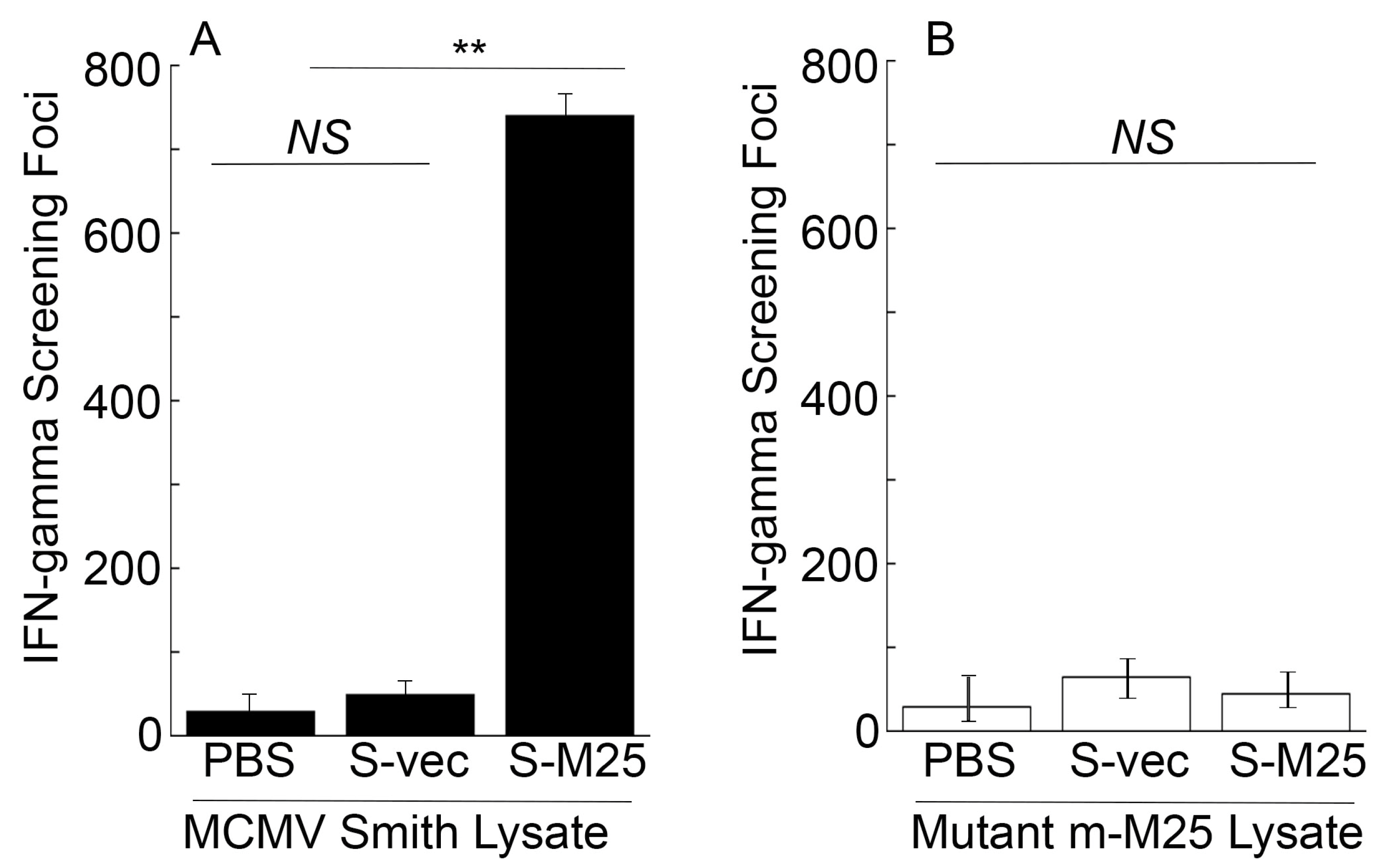 To assess the T cell responses elicited by the vaccines, splenocytes were collected from mice 42 days post-immunization and allowed to react with the Smith-infected and m-M25-infeced cell lysates. In experiments with the Smith-infected cell lysates, we observed about 80 times higher anti-MCMV IFN-γ-producing T cell responses in mice vaccinated with S-M25 than those vaccinated with S-vec (Figure 4A). On the contrary, we observed little anti-MCMV T cell response in all vaccinated mice in experiments with the m-M25-infected cell lysates (Figure 4B). Thus, vaccine S-M25 appeared to elicit M25-specific T cell responses.