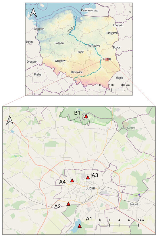 The study was conducted in Lublin (51°15′0″ N 22°34′0″ E), which is one of the largest cities in Poland in terms of population, and its surroundings. Lublin occupies a topographically diverse area of 147.5 km2. Its western part has a varied topography with numerous deep dry valleys, hills, and loess ravines. In turn, the eastern part of the city has a flat surface. Within the administrative boundaries of Lublin, there are many green areas (parks, several forests, including Dąbrowa and Stary Gaj forests) and Zalew Zemborzycki Lake. There are also large forest complexes in the city’s surroundings.
