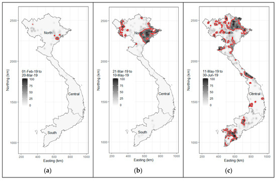 African swine fever in Vietnam, February to June 2019. Image plots showing the number of ASF-infected communes per square kilometer: (a) 1 February to 20 March; (b) 21 March to 10 May; and (c) 11 May to 30 June. Contour lines on each plot show areas where there were more than 40 ASF-positive communes per 100 communes per square kilometer.