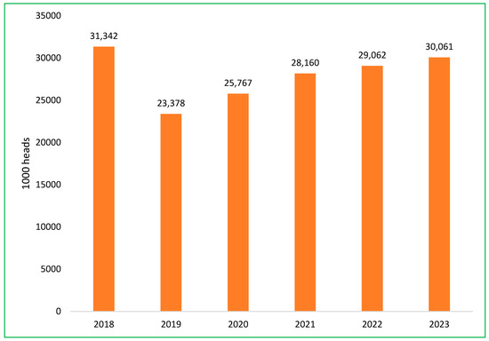 The Vietnamese swine sector is currently experiencing a recovery, with an annual growth rate of 6.3% in pig herds, as efforts to rebuild following the impact of ASF continue [49]. The total pig population at the end of 2023 was more than 30 million head, approximately equal to 2018, before the ASF epidemic [52]. The impact of the ASF outbreak on the total swine population in Vietnam is depicted in Figure 7 [48,52]. The government’s role, combined with private sector investments, aims to strengthen biosecurity, improve production standards, and establish disease-resistant breeding practices to safeguard the industry against future outbreaks.