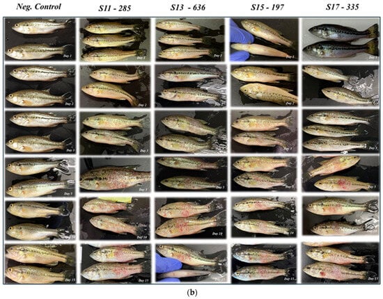 Pathogenicity accounts for the strain’s ability to invade fish tissues, replicate within the host, and cause pathological changes indicative of disease []. Pathogenicity studies typically aim to elucidate various aspects of the bacterium’s interaction with the host, including its mechanisms of infection, virulence factors, host immune response, and disease progression. The catfish-derived E. piscicida isolates used in this study harbor virulence genes such as hemolysin, adhesin, invasin, etc., [,,]. These can influence the bacterium’s ability to adhere to fish tissues, evade the host immune response, and produce toxins that contribute to tissue damage and disease progression.