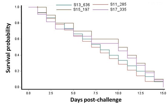 Largemouth bass fingerlings challenged with E. piscicida isolates (S11-285, S13-636, S15-197, and S17-335) indicated significant mortality compared to the control groups (Figure 3). The cumulative mortality in the experimentally infected largemouth bass ranged from 40 to 54% (Figure 3). There were no significant differences in mortality caused by the different genetic groups (differentiated by Multilocus Sequence Analysis (MLSA)) of E. piscicida in largemouth bass. Kaplan–Meier survival estimates (15-day survival rate) of largemouth bass fingerlings challenged with E. piscicida are provided (Figure 4).