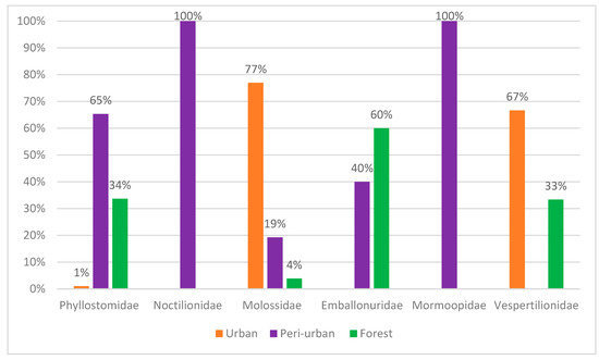 Sixty seven percent of specimens were captured in peri-urban areas (Figure 2). Of these, 46% belonged to the Phyllostomidae family and 37% to the Noctilionidae family. The families Emballonuridae, Mormoopidae and Molossidae were responsible for 7%, 6% and 4% of captures, respectively.
