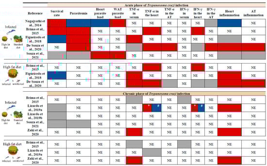 - Figueiredo, V.P.; Junior, E.S.L.; Lopes, L.R.; Simões, N.F.; Penitente, A.R.; Bearzoti, E.; Vieira, P.M.d.A.; Schulz, R.; Talvani, A. High Fat Diet Modulates Inflammatory Parameters in the Heart and Liver during Acute T. cruzi Infection. Int. Immunopharmacol. 2018, 64, 192–200. [Google Scholar] [CrossRef]