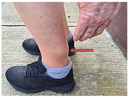 Figure 1. Status of the patient’s left lower leg at the early stage of the disease (slightly painful, gradually growing tumorous swelling is indicated by the red arrow).