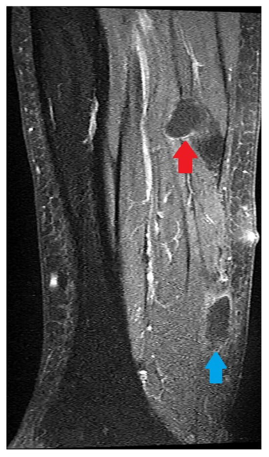 Figure 2. A postcontrast magnetic resonance imaging (MRI) scan of the patient’s left calf, performed on 18 June 2024, after surgical incision, revealed two focal lesions with different morphological features (red and blue arrows). The first one was situated in the proximal part of the calf, inside the soleus muscle. At the postcontrast T1 WI MRI scan, the lesion was dominantly hypointensive compared with the surrounding muscle with discreet postcontrast ring enhancement, with defined contours (red arrow). The second lesion was an extramuscular, subfascial collection of dense fluid, located in the distal third of the left calf, near the dorsal part of the soleus muscle and the dorsal part of the Achilles tendon. On a postcontrast T1 WI MRI scan, the lesion was hypointense with postcontrast ring enhancement and no clear border (blue arrow).