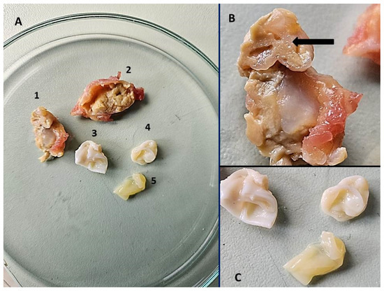 Figure 3. Cysts and tissue sections (1–5) removed from the patient’s left calf during surgery in September 2024 which were used in molecular diagnostic testing (A). A large portion of the sample that tested positive for E. multilocularis labeled with a black arrow (sample 1) (B). Cysts positive for E. granulosus (samples 3–5) (C).