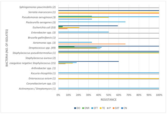 Table 3, Table 4 and Table 5 present the prevalence of isolated pathogens in this study and the results of antimicrobial susceptibility testing. Figure 2, Figure 3, Figure 4 and Figure 5 show the average antimicrobial resistance for each studied antimicrobial. When results from antimicrobial susceptibility were evaluated, the most efficient antimicrobials were gentamicin, trimethoprim-sulfamethoxazole, and enrofloxacin. All Gram-positive bacteria evaluated were susceptible to the trimethoprim-sulfamethoxazol association. It was revealed that a high proportion of the tested bacteria showed resistance to broad-spectrum doxycycline and ceftiofur, and to penicillin. For example, numerous Streptococcus spp. were resistant to penicillin and ceftiofur, and all showed resistance to doxycycline. However, E. coli showed low resistance (less than <10%) to ceftiofur and total susceptibility to gentamicin.