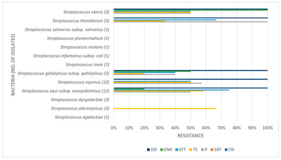 Some isolates were multidrug-resistant (MDR) strains, namely seven Str. equi zooepidemicus, four Str. equinus, two Str. gallolyticus gallolyticus, two Str. thoraltensis, one Str. uberis, one S. pseudintermedius, one E. coli, one Pseudomonas aeruginosa, and one Serratia marcescens.