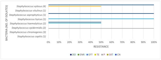 Antimicrobial resistance profile regarding coagulase negative staphylococci. CN: gentamicin; SXT: trimethoprim-sulfamethoxazole; P: penicillin; TE: tetracycline; EFT: ceftiofur; ENR: enrofloxacin; DO: doxycycline.