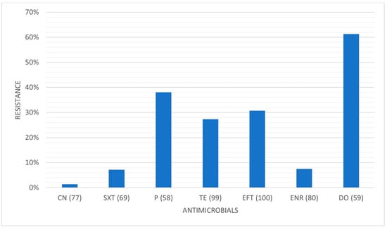 Average antimicrobial resistance for each studied antimicrobial. CN: gentamicin; SXT: trimethoprim-sulfamethoxazole; P: penicillin; TE: tetracycline; EFT: ceftiofur; ENR: enrofloxacin; DO: doxycycline. (x): number of isolates tested for that specific antimicrobial.