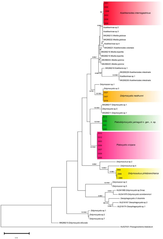 Platocystis vivipara ITS2 sequences from this study were identical and produced a cluster, closely related to the Platodidymocystis yamagutii n. gen., n. sp. clade, as mentioned above. There are no reference sequences from the Platocystis genus with a suitable length available for the present ITS2 phylogenetic analysis, only the shortened from P. alalongae [FJ628687-9].