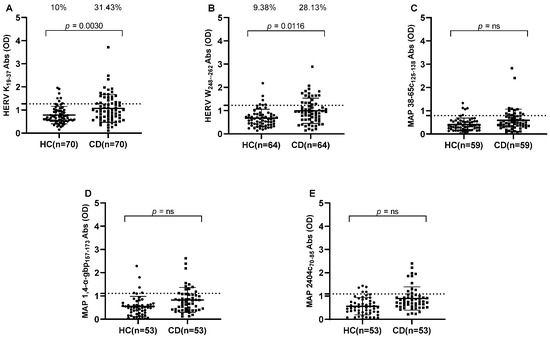ELISA-based antibodies reactivity analysis against HERV and MAP peptides in CD patients and HCs. Plasma samples from subjects were tested against HERV-K(19–37) (A), HERV-W(248–262) (B), MAP 38-65c(125–138) (C), MAP 1,4-α-gbp(157–173) (D), and MAP 2404c(70–85) (E). Dashed lines indicate thresholds for Abs calculated by ROC analysis, which were used to assess sample positivity. p-values derived from Fisher’s exact test and AUC are indicated in the graph, along with percentages of positive patients in the upper section of each graph. A p-value greater than 0.05 was considered statistically significant, while “ns” indicates non-significant results.