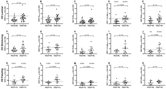 ELISA based antibodies reactivity analysis against HERV and MAP peptides in CD patients and HCs, categorized by CD clinical symptoms. (A–E) Healthy and luminal CD subjects tested against HERV-K(19–37), HERV-W(248–262), MAP 38-65C(125–138), MAP 1,4-α-gbp(157–173), and MAP 2404c(70–85) peptides, respectively. (F–J) Healthy and stricturing CD subjects tested against HERV-K(19–37), HERV-W(248–262), MAP 38-65C(125–138), MAP 1,4-α-gbp(157–173), and MAP 2404c(70–85) peptides, respectively. (K–O) Healthy and fistuling CD subjects tested against HERV-K(19–37), HERV-W(248–262), MAP 38-65C(125–138), MAP 1,4-α-gbp(157–173), and MAP 2404c(70–85) peptides, respectively. Dashed lines indicate Abs thresholds calculated by ROC analysis, which were used to assess sample positivity. p-values derived from Fisher’s exact test along with percentages of positive patients are displayed in upper sections of graphs. A p-value greater than 0.05 was considered statistically significant, while “ns” indicates non-significant results.