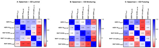 Heat-map indicating r values computed using Spearman correlation analysis among peptides HERV-K(19–37), HERV-W(248–262), MAP 38-65C(125–138), MAP 1,4-α-gbp(157–173), and MAP 2404c(70–85) in Crohn’s disease cohort categorized based on disease behavior as luminal (A), stricturing (B), and fistuling (C).