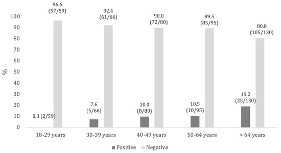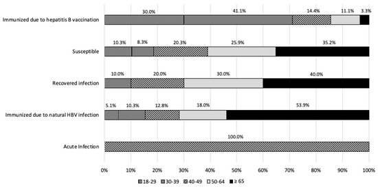 According to the age, susceptible subjects were mainly aged >39 years old; as a matter of fact, in the younger age groups, we found the higher percentage of immunization due to vaccination (45.8% in the 18–29-year-old age group and 56.0% in subjects aged 30–39 years old). Moreover, similar values were observed for natural infection-acquired immunity across different age groups, and the acute infection status was found only in the 40–49-year-old age group (0.2%) (Table 6, Figure 2).