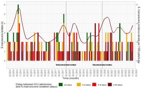 Our main cohort encompassed ICU patients from January 2014 to December 2022 who had a screening or clinical culture positive for S. marcescens more than 48 h (D2) after ICU admission and up to 14 days post-discharge. Two sensitivity analyses were also performed: SCohort 1 included patients with any S. marcescens-positive result from time zero (D0) of ICU admission to 14 days after ICU discharge, and SCohort 2 included patients with a first negative screening or clinical sample (urine or respiratory sample) during ICU stay, and with a subsequent screening or clinical sample positive for S. marcescens more than 72 h after ICU admission. Only the first isolate per patient was considered. Consecutive ICU stays shorter than 30 days were merged to account for repeated admissions. We collected patient-related variables (SAPS II, length of stay in days, ventilation days), infection control metrics (hand hygiene adherence, antibiotic pressure, number of daily SOD prescriptions, as defined above), and healthcare workload as the project research of nursing score (PRN).
