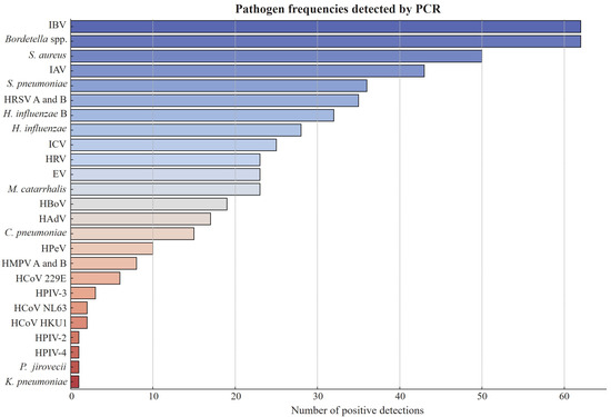 The study analyzed 458 participants for respiratory pathogens, revealing a broad spectrum of infections and coinfections. The most common pathogens were influenza B virus (IBV) and Bordetella spp., each detected in 62 participants (13.5%). Staphylococcus aureus infected 50 participants (10.9%), followed by influenza A virus (IAV) in 43 (9.4%) and Streptococcus pneumoniae in 36 (7.9%) (Figure 1). Other frequently detected pathogens included human respiratory syncytial virus (HRSV A and B) in 35 participants (7.6%), Haemophilus influenzae type B (32, 7.0%), and Haemophilus influenzae (28, 6.1%). Influenza C virus (ICV) was found in 25 participants (5.5%). Viral infections such as human rhinovirus (HRV), enterovirus (EV), and Moraxella catarrhalis affected 23 participants (5.0%) each.
