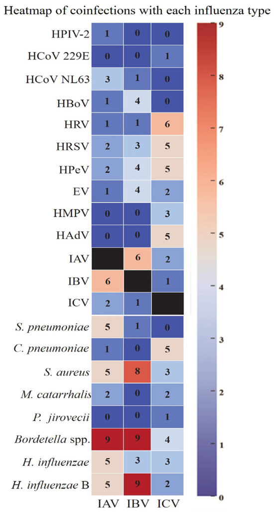 A heatmap of coinfections associated with each influenza type. This heatmap illustrates the frequency of viral and bacterial coinfections observed in patients with different types of influenza: influenza A virus (IAV), influenza B virus (IBV), and influenza C virus (ICV). The intensity of the color corresponds to the number of cases, with darker blue indicating fewer cases and red indicating a higher frequency of coinfections. The y-axis lists the identified pathogens, including respiratory viruses (e.g., HPIV-2, HCoV 229E, RSV, HMPV) and bacterial species (e.g., S. pneumoniae, S. aureus, Bordetella spp.). The numbers within the heatmap cells represent the count of cases in which a given pathogen was co-detected with the respective influenza type. The black cells represent cases of the respective influenza virus without coinfection.