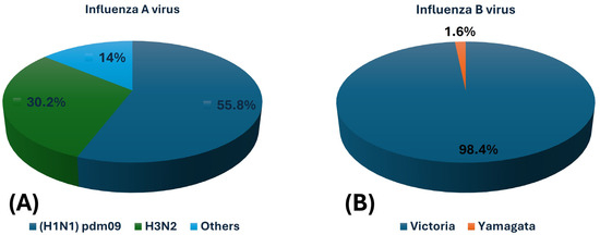 Distribution of influenza A and B virus strains detected in the study cohort. (A) Influenza A virus (IAV) subtypes: H1N1 (pdm09) accounted for 55.8%, H3N2 for 30.2%, and other subtypes for 14.0%. (B) Influenza B virus (IBV) lineages: Victoria lineage constituted 98.4% of IBV cases, while Yamagata lineage was detected in 1.6%.