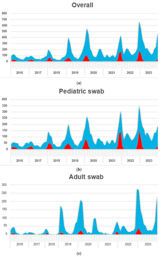 Swab trends: (a) overall, (b) pediatric, and (c) adults. (x-axis: years; y-axis: frequency; red area: positive cases; blue area: negative cases).