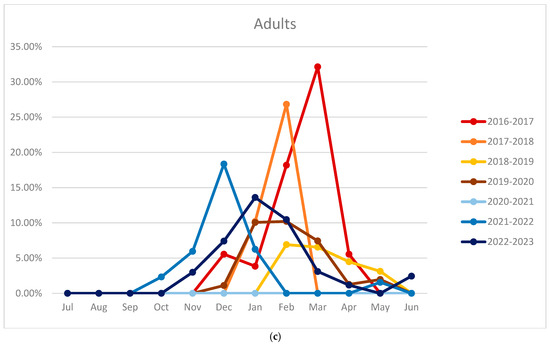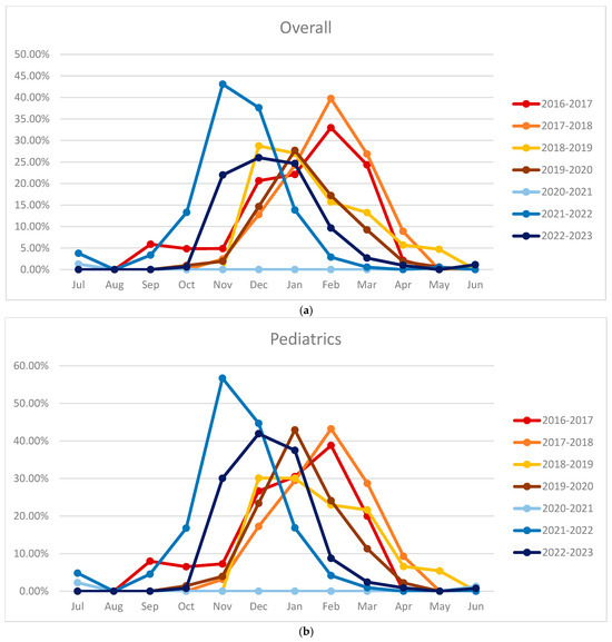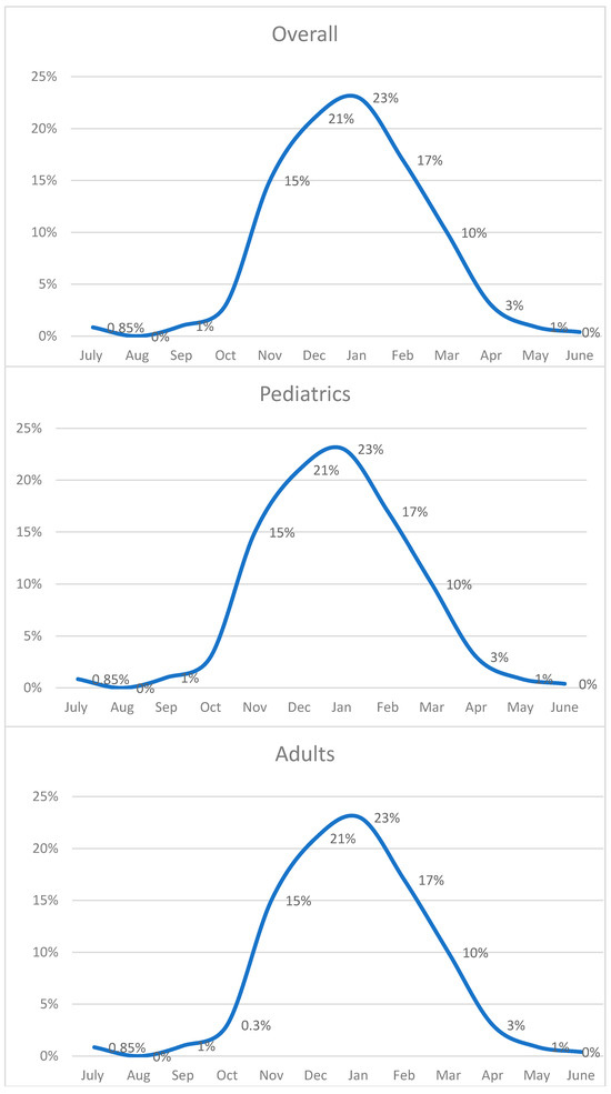 Comparison between the seasonal peaks—(a) overall, (b) pediatric, and (c) adult (x-axis: months; y-axis: percentage).